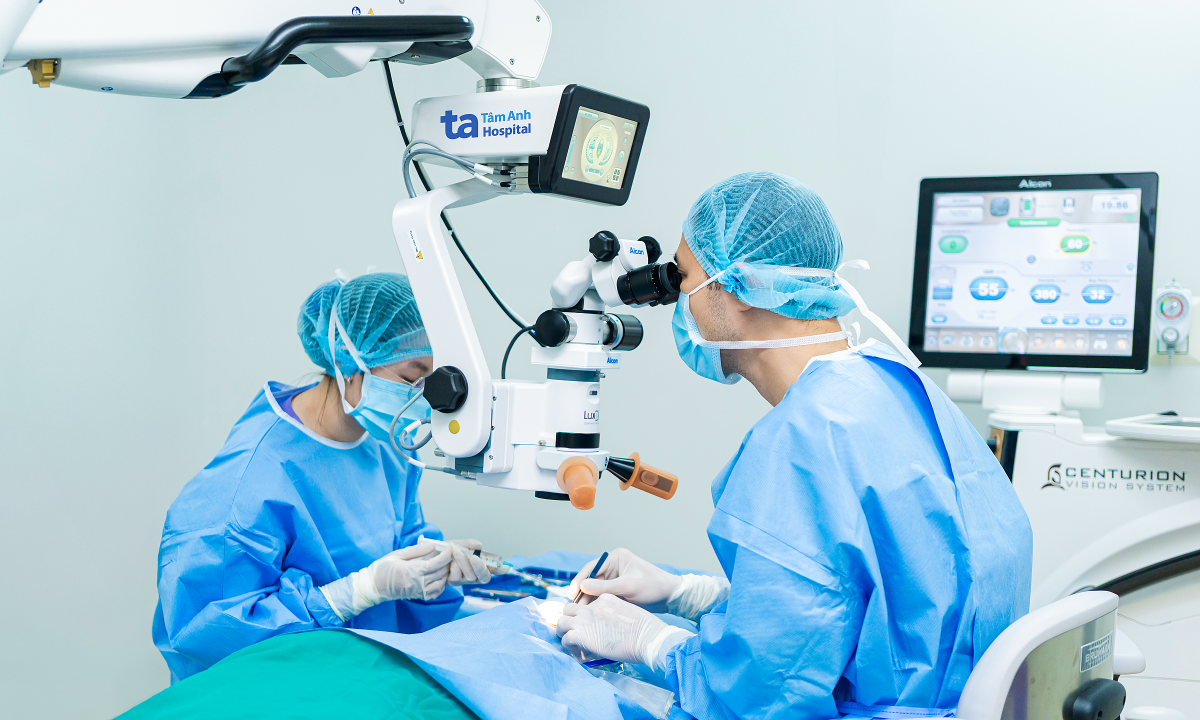 Bác sĩ thay thủy tinh thể cho bà Thanh. Ảnh: Bệnh viện Đa khoa Tâm Anh